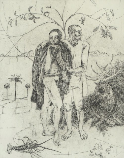 Jenna Packer has used the exhibition title as a key to explore knowledge systems in her etching Paradise Lost (2018), pointing out that Daniel Solander was striking in his thirst for knowledge. She develops German artist Lucas Cranach’s 16th-century portrayals of Adam and Eve, placing them beneath a Tree of Knowledge that is: