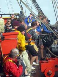 Out in the swell properly now and many of the crew are affected with seasickness, they take in fresh air on deck and their shipmates attend them with “happy buckets”. Those feeling green try different methods of reducing their symptoms like looking at the horizon line. It has been a busy first day at sea, Ally the foremast topman says he’s no time to eat, “there’s plenty of food, but too much work to do!”