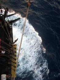 The winds are up so there is sail handling to do. After lunch mainmast watch is aloft putting a double reef in the fore topsail; reefs reduce the size of a sail, preventing stress on te rigging in strengthening winds. Reefs reduce the effective capacity of a sail, ensuring the sail is filled and kept tight in lighter winds and achieves the best rate of knots. By 1400 hours Matt the boatswain’s mate is excited because we’ve lost sight of land, “we’re gunning it!” And he can’t do his maintenance work painting the port side anchor; it’s wet from bow waves splashing the deck.