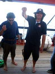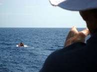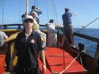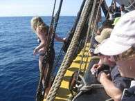 Darbey is heard on the radio: “Man overboard recovered!” Ross, the captain, looks at Dirk and asks for the time, “ten minutes precisely.” It is calm conditions, with nil ship speed, and in 10 minutes the man overboard drifted 0.2 nautical miles (about 370 metres). It is a clear demonstration of the necessity for a speedy rescue should a real emergency arise, which would be more likely to occur under strenuous sea conditions. Oscar is appropriately chastised on his return and told not to do it again. After the drill, with the rescue boat in the water and Bark Endeavour heaved to, the crew are rewarded for their efforts with a unique experience: a swim in the open ocean with 4000 metres of water below them, and 65 nautical miles from land – well beyond the edge of the continental shelf. It is a welcome reprieve from the heat and humidity aboard ship the last two days, the water is blue and pristine clear: absolutely refreshing.