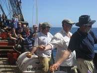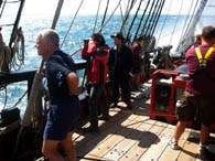 At 1640 the top gallants are clewed, followed by furling. There are many cameras watching from the deck below; sail handling – up so high in perfect weather – is a pretty sight. Except one voyage crew member up on the yard calls: “No more butt shots!” Pictures taken from below and behind a yard while a crew member is hanging over it can be less than flattering (or more flattering – as the case may be!).