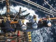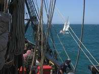 The night passes smoothly with a little lightning teasing from the horizon but not drawing closer, at 2200 hours the wind is backing rapidly, blowing north-west and north, freshening force 4. During the 0400-0800 watch with mizzenmast watch on duty there is a splendid shooting star: space debris burning large and blue, similar to a comet. A pod of dolphins also welcomes the ship into the day. It is another beautiful morning, with french toast on the breakfast menu (known as Matt’s french toast, the boatswain’s mate, for it’s his favourite brekkie). And on either side of breakfast all the sails are clewed, followed by a whole lot of furling.