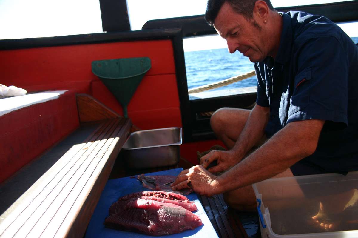 While wearing ship Steve notices that we have finally got a fish on the Engineers fishing line, the first one since leaving Sydney. Steve and Captain Ross pull in the line and land a decent sized tuna. Now the question is who caught the fish? Is it the engineer Mark, because it is his tackle and line, or is it Captain Ross and Steve because they landed it? Comments and thoughts on this one would be appreciated.