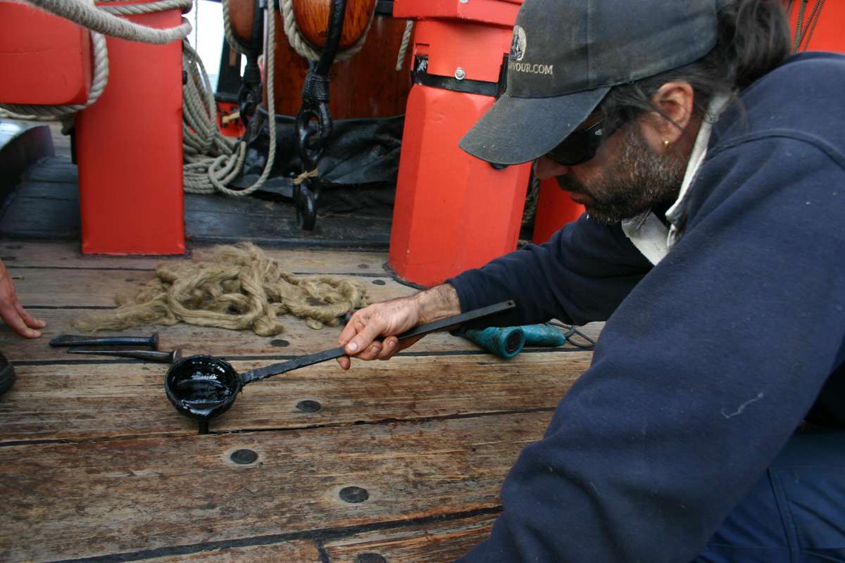 Boatswain Ant pouring the pitch on the top of the Oakum