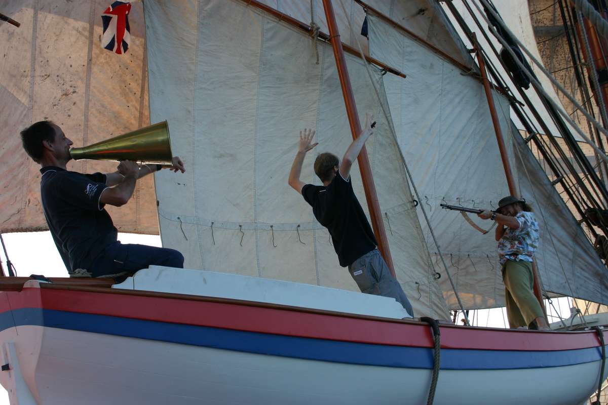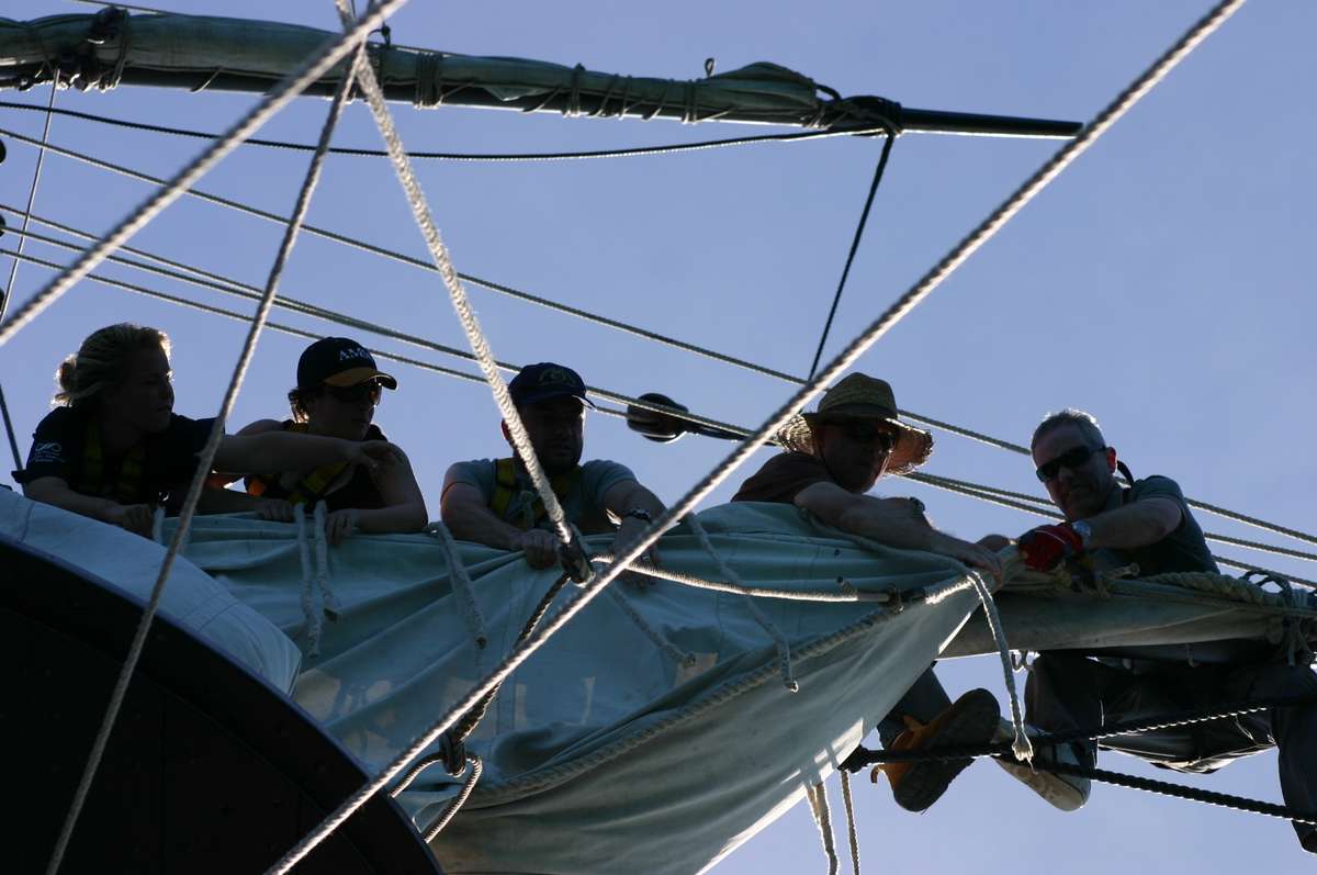 The afternoon brings a lecture and lesson on how to use the sextant and the accuracy that can be achieved with the correct use. It is a fantastic day with light winds, so we have all the standard rigging set including the Mizzen Driver. The Mizzen driver is used when you want to sail close down wind. It is a large square sail that goes aft on the peak of the Mizzen and runs down. Even with all this sail set it still isn’t enough for the Chief Officer Dirk and Cook’s mate Eddie. They then start to set the Pinnace Lugs’ls in the hope that it might give us that extra bit of wind. The Pinnace was the traditional boat onboard Endeavour that Cook and his crew would use to go ashore and explore in.