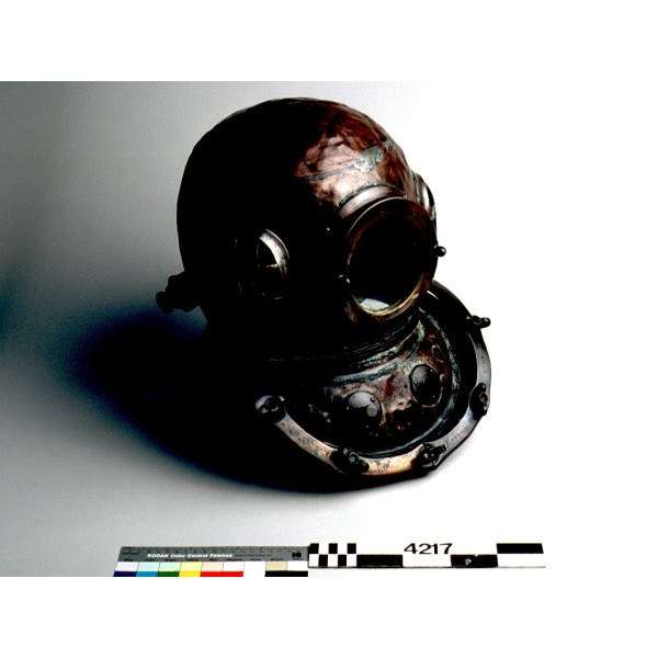 This type of brass hard-hat airtight diving helmet (00004217) was commonly used in the late 19th century for pearl shell diving. Along with the helmet, a pearler would wear layers of woollen garments underneath a waterproof suit, as well as mittens and weighted boots. The helmet was screwed onto the top of the suit. Pearlers would wear up to 50kg of weight which was strapped to their chest and back. They also wore a belt which carried a scabbard, knife and rope which could send signals back to the crew. Air was supplied to the pearler manually through an air hose, with two men on board the boat turning two large wheels.