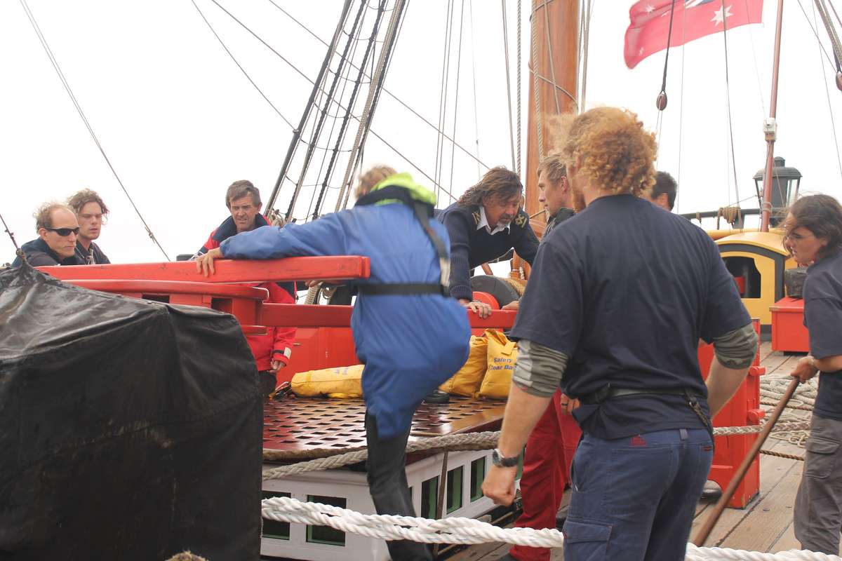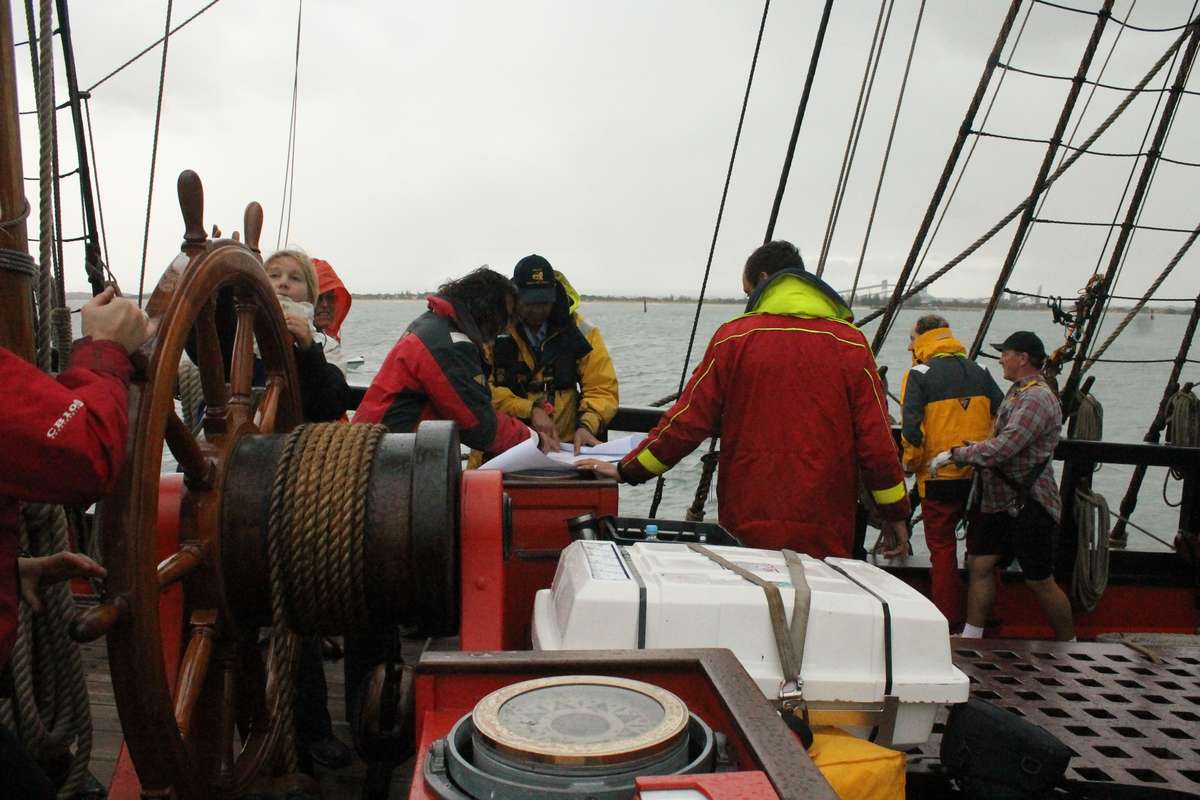crew on deck in wet weather gear and harnesses. When arriving on deck it