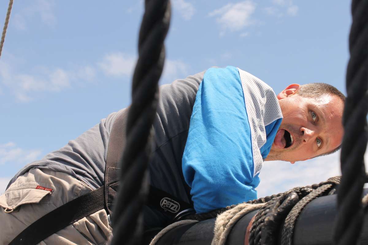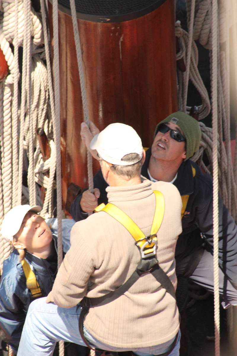 By 2030 the watch is handing the Main course and Fore course as we are making good speed and need to slow down so that we arrive at the anchorage during the day. During the night the swell eases down and it is good to see so many people looking cheerful on deck in the morning.