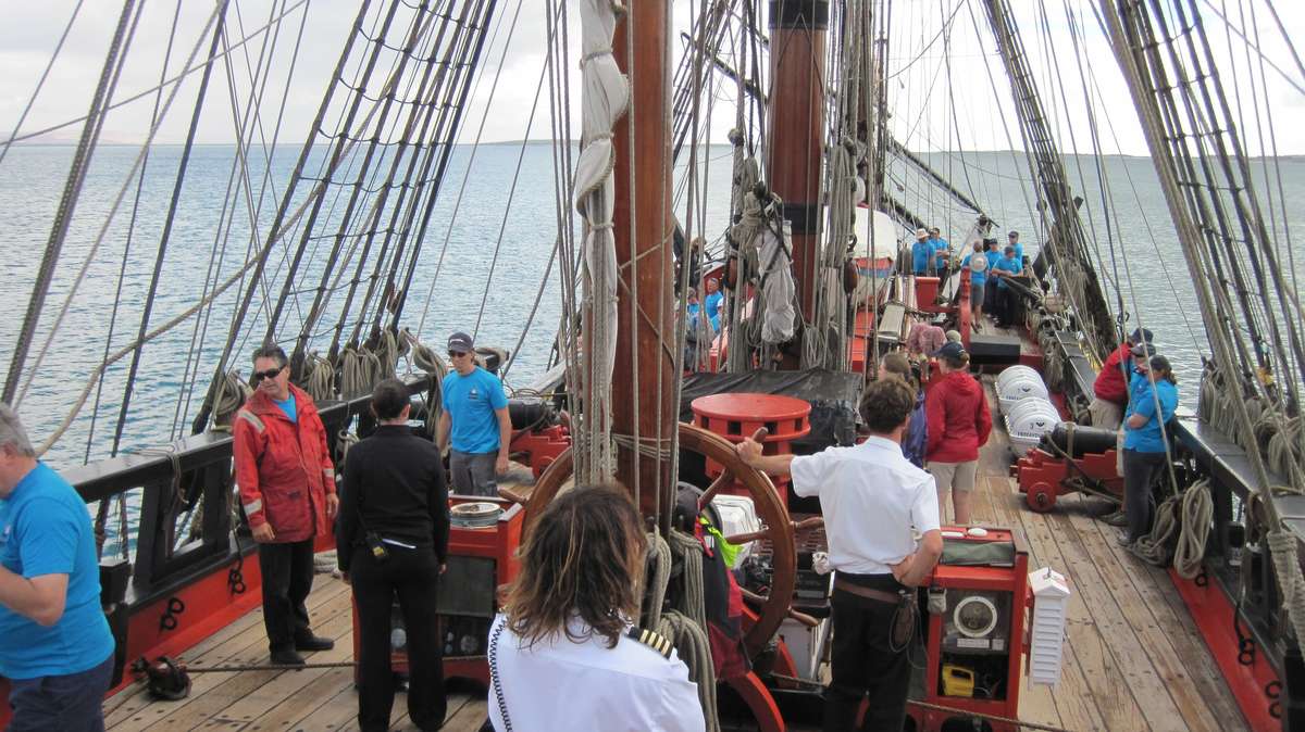 Safety round and lifejacket demonstrations were discussed on the quarterdeck with our second officer Ally, while Captain Ross discussed helming and compass work and Dirk our Chief officer was on the bow discussing Harnesses and sea sickness.