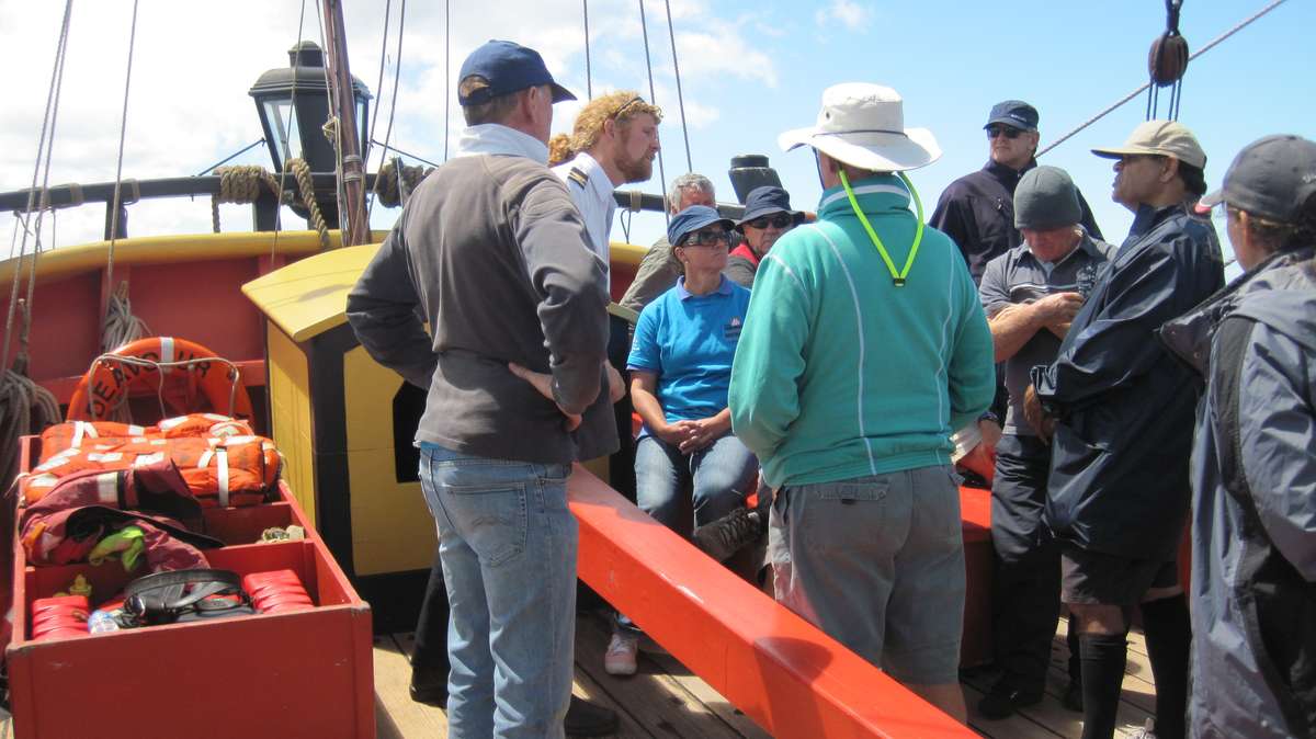 Once all voyage crew were on board, the usual introductions and tours of the ship commenced, with wet weather gear all round. Soon enough we were beginning to sail from our berth in Port Lincoln to our anchorage in Proper Bay just below the Flinders monument.