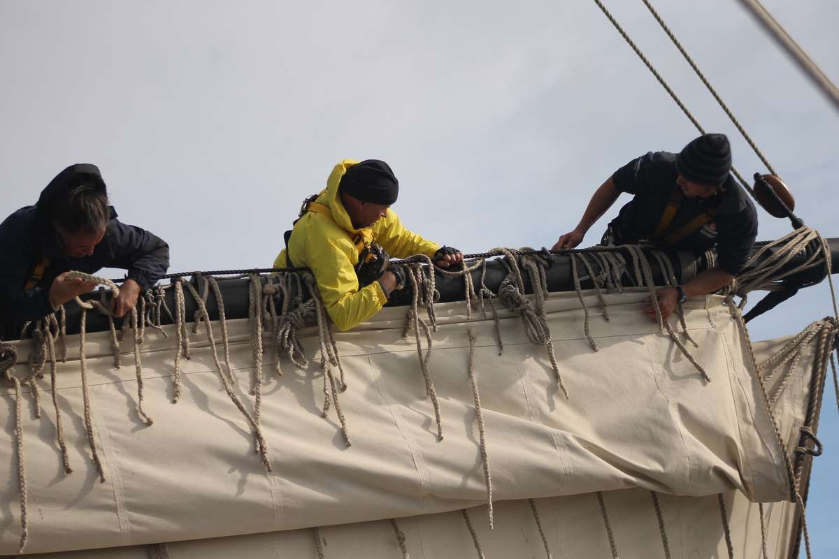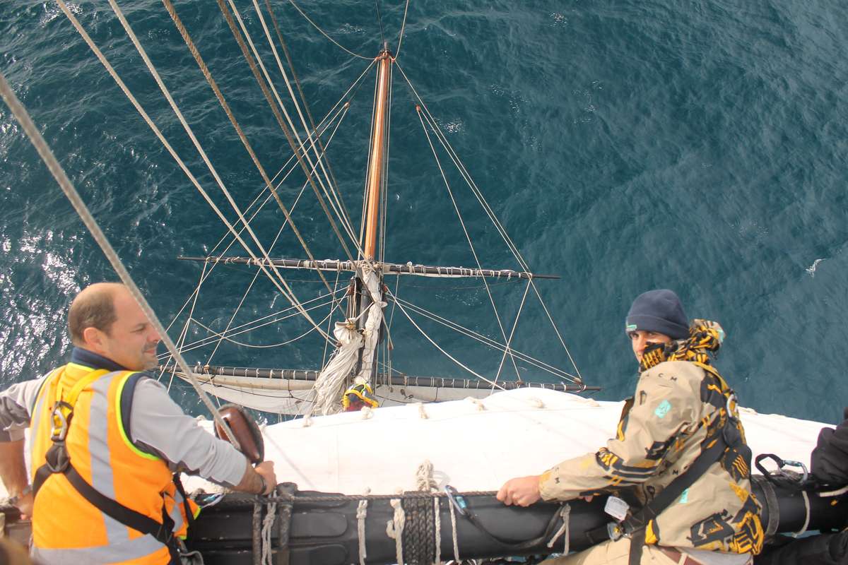 The few that are still feeling slightly crook are on deck and enjoying the sunshine. At 1100 all hands are called on deck to strike the topsails in preparation to shake out our reefs, which were put in on the second day due to the forecast of the stronger winds we endured. Foremast goes up to the foremast and mainmast goes up to the mainmast and Mizzenmast who are currently on watch head out on to the bow sprit to lose the sprit sail. Once down the crew mates relate their stories and feeling of achievement from their climb, there is not too much time for talking though as the sails need to be re-set.
