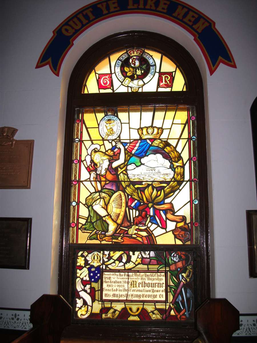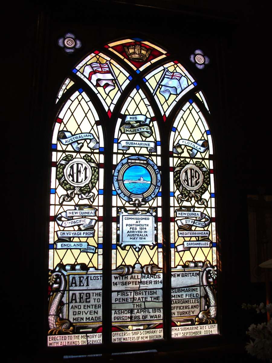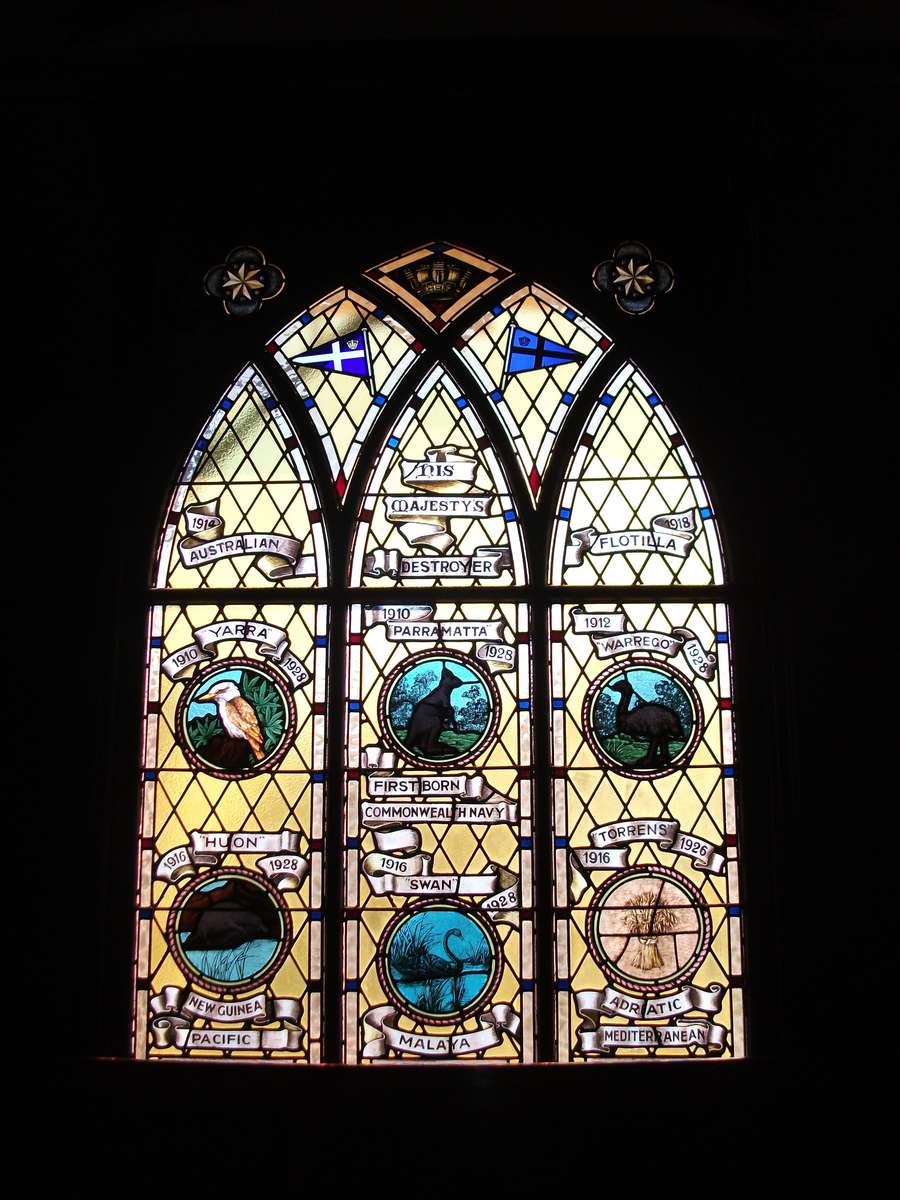 Last Sunday I attended the annual Fairmile Association Church Service in one of the most beautiful and interesting chapels around. Located on Sydney’s Garden Island – the east coast base for the Royal Australian Navy – the chapel is one of the earliest main buildings on the Island, dating from 1886. It was erected originally as a rigging house but over the years became a rather plain chapel. Gradually it metamorphosed into a delightful place of worship and reflection. The plain glass windows were replaced firstly with gelatine windows that gave an illusion of stained glass, and then real stained glass was fitted. Today, each window is a stunning naval memorial in glass.